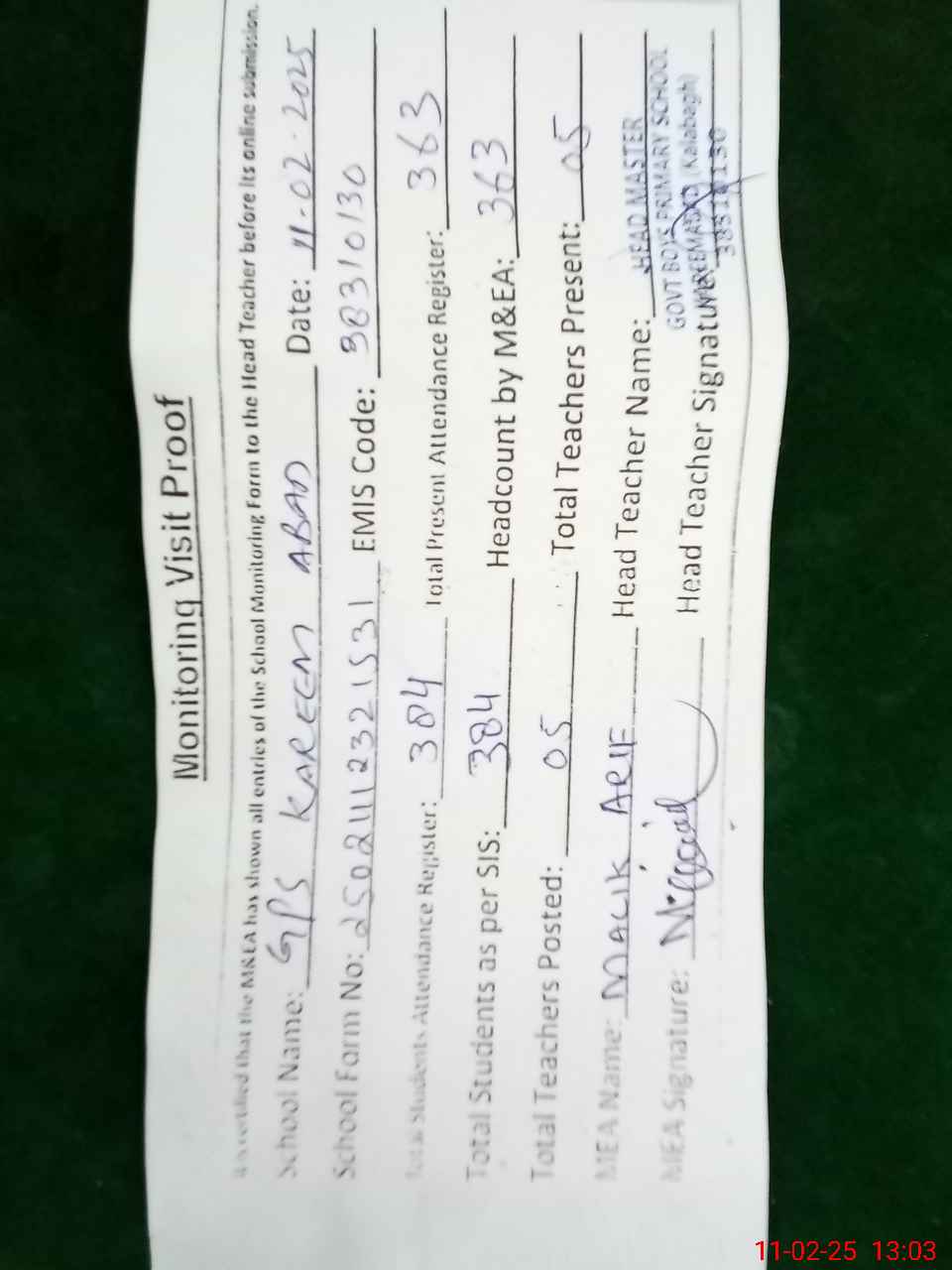 | Attendance Register | Head Teacher | MEA with School | Visit Proof |