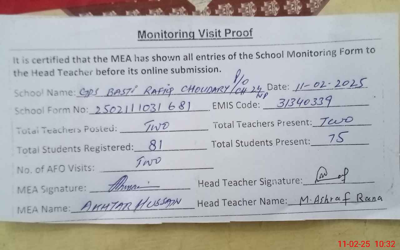| EMIS Code: 31340339 | Name of School: GPS BASTI RAFIQ CH. PO CHAK NO 24 | |||