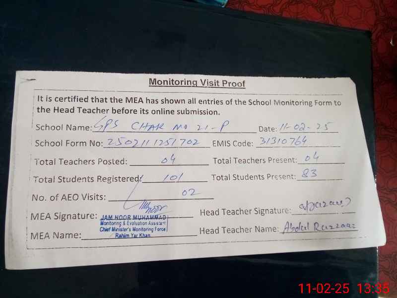 | EMIS Code: 31310764 | Name of School: GPS CHAK NO 21 P | |||
