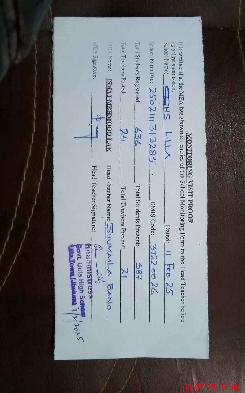 | Certified that this School was Inspected by the Undersigned MEA/DMO Today and the Information Stated Above is as Per Record. | |||||