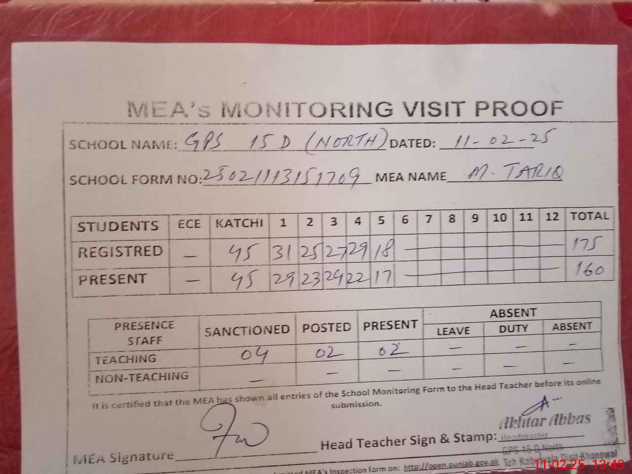| Attendance Register | Head Teacher | MEA with School | Visit Proof |