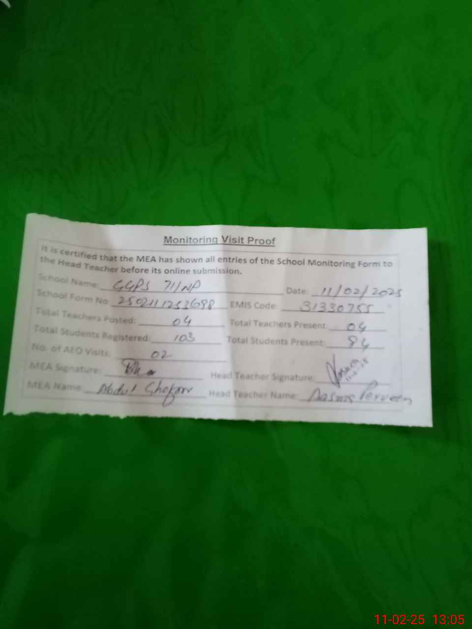 | Attendance Register | Head Teacher | MEA with School | Visit Proof |