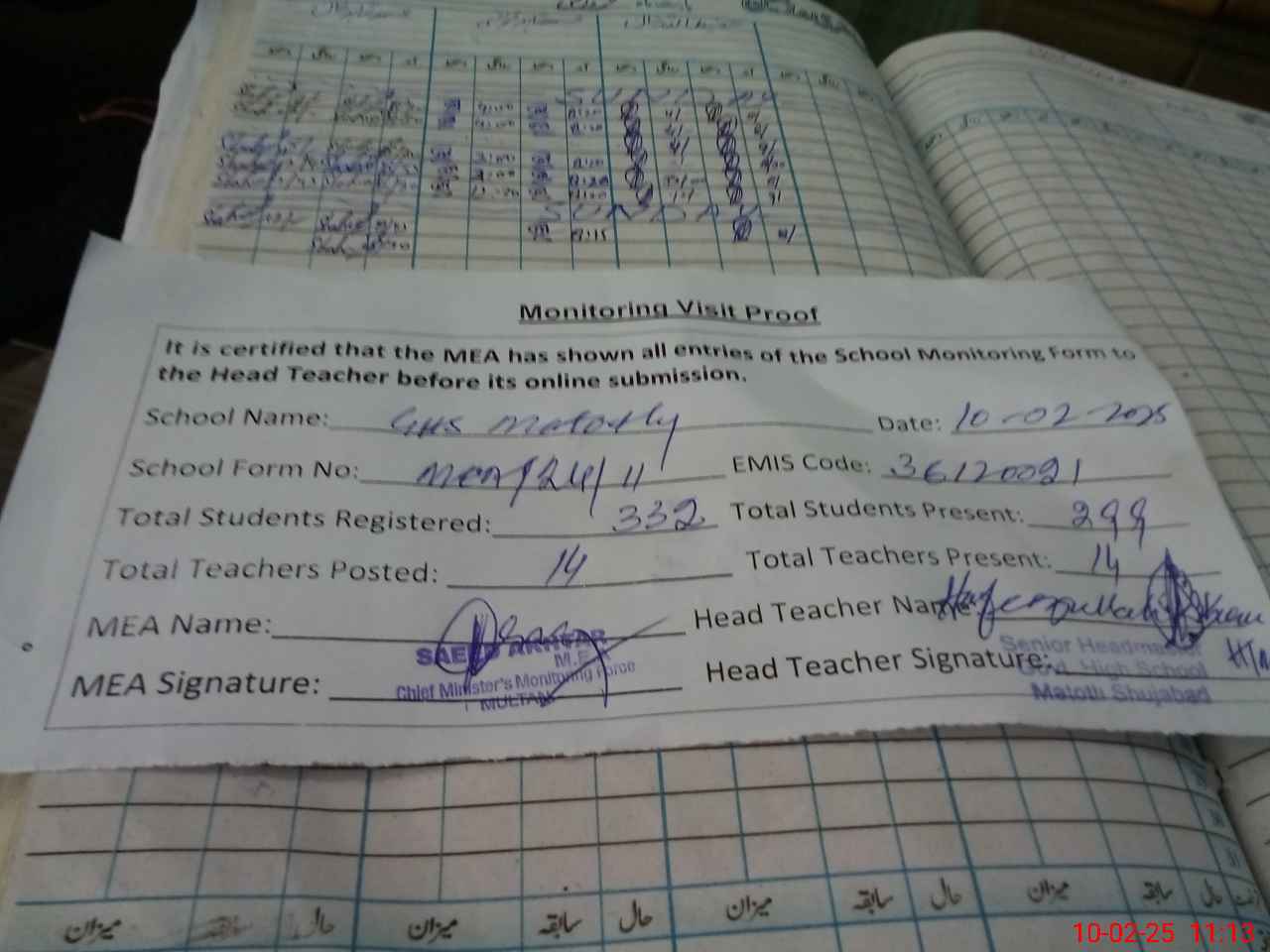 | Attendance Register | Head Teacher | MEA with School | Visit Proof |