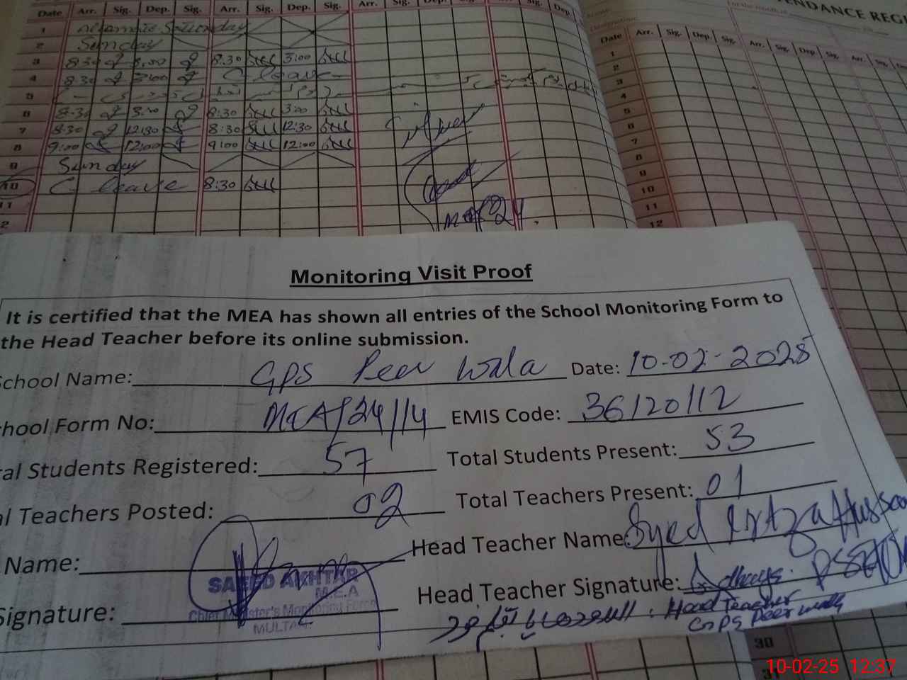 | Attendance Register | Head Teacher | MEA with School | Visit Proof |