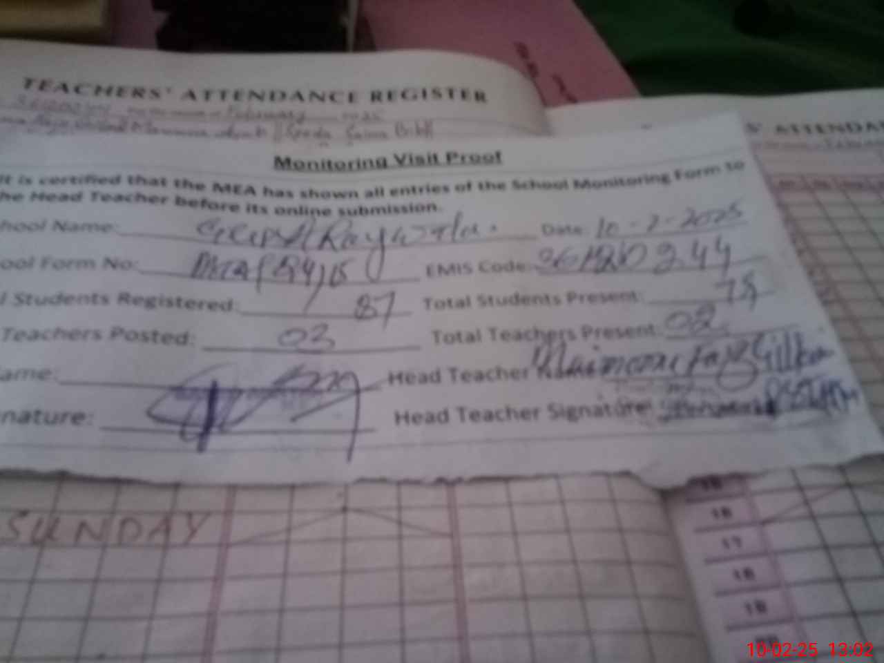 | Attendance Register | Head Teacher | MEA with School | Visit Proof |