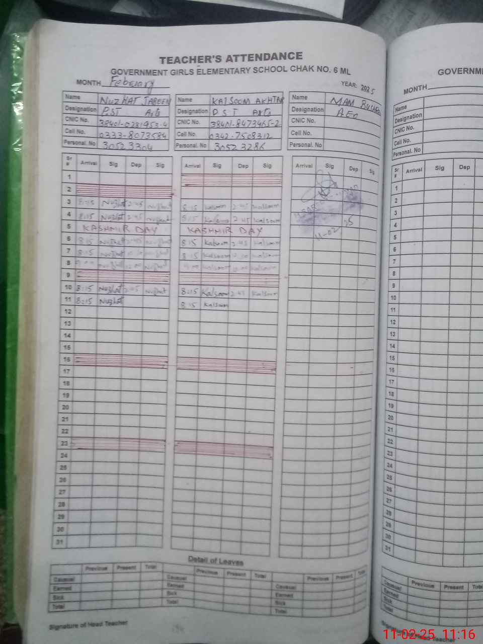 | CNIC | Full Name | Designation | R/C | Absence During Last Calender Month |