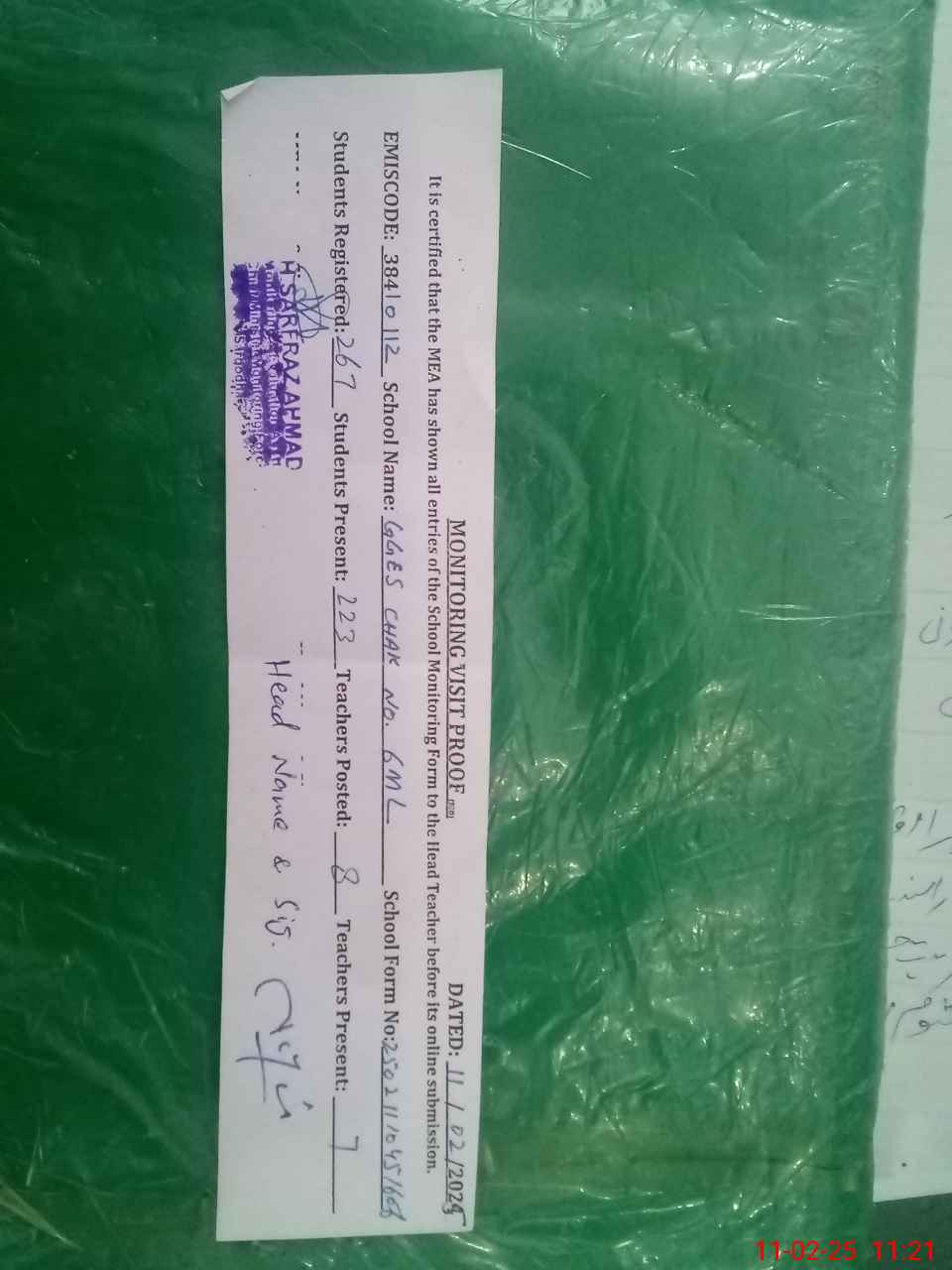 | Attendance Register | Head Teacher | MEA with School | Visit Proof |