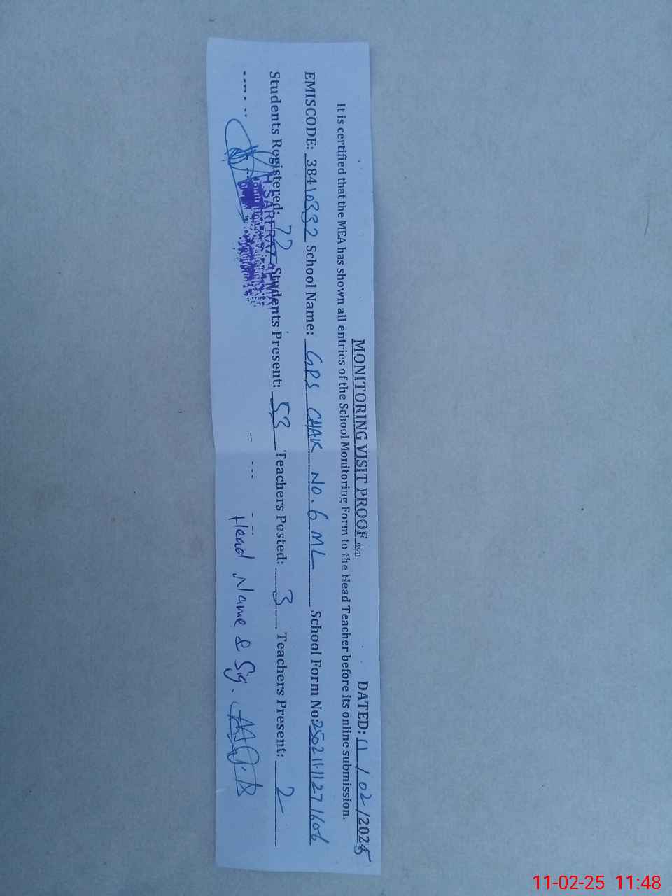 | EMIS Code: 38410332 | Name of School: GPS CHAK NO.6 ML | |||
