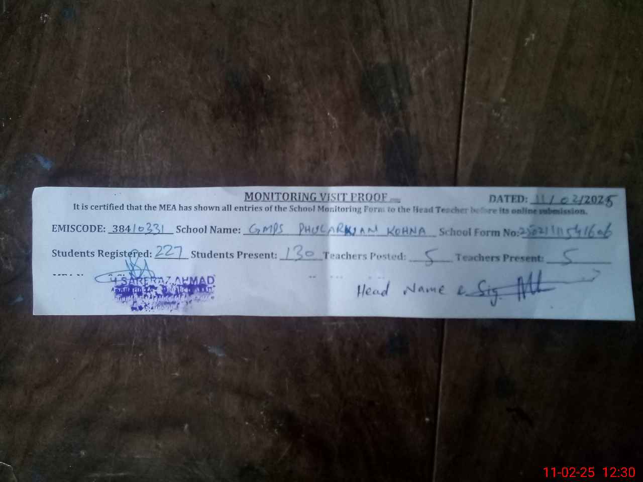 | Attendance Register | Head Teacher | MEA with School | Visit Proof |