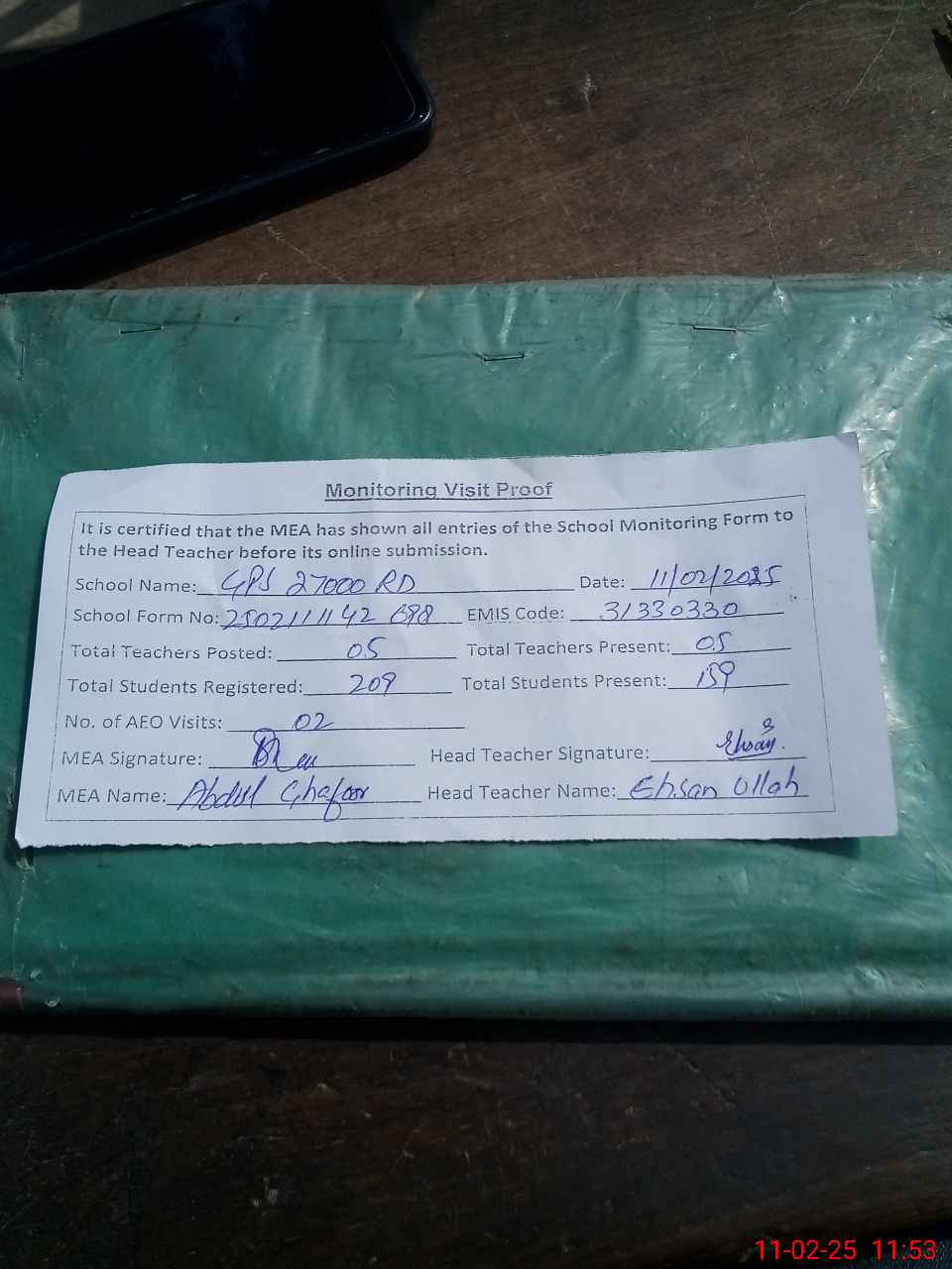 | Attendance Register | Head Teacher | MEA with School | Visit Proof |