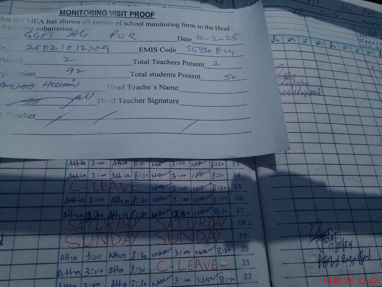 | Attendance Register | Head Teacher | MEA with School | Visit Proof |