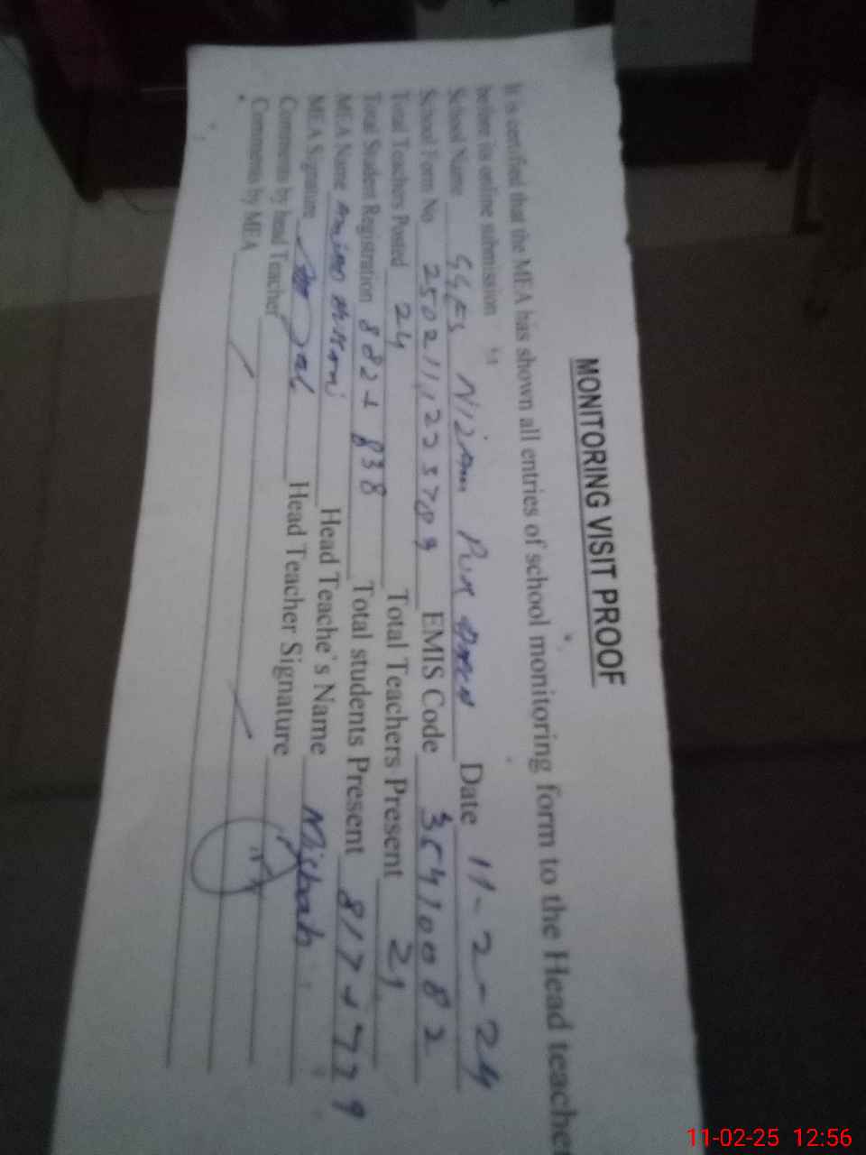 | Attendance Register | Head Teacher | MEA with School | Visit Proof |