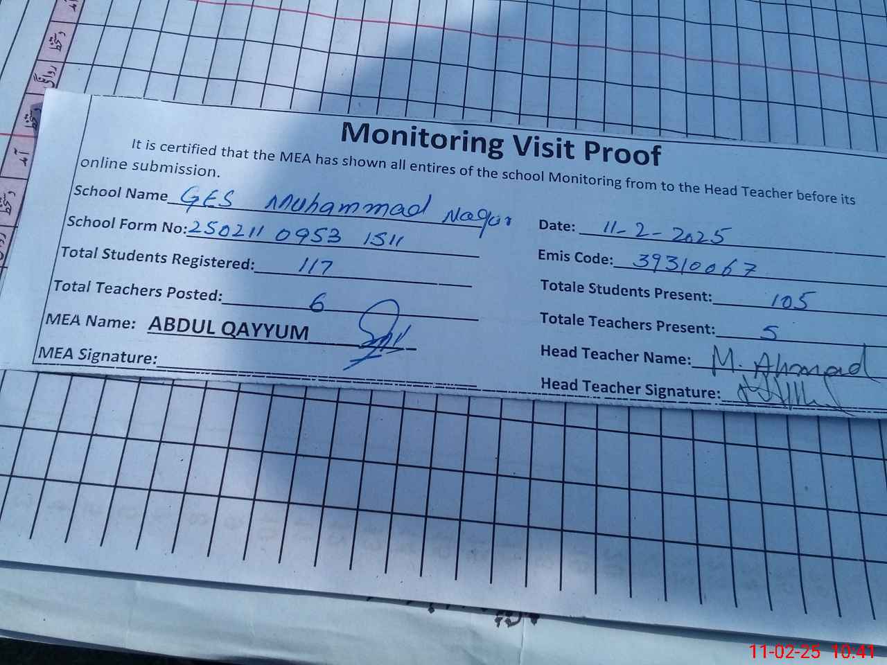 | Attendance Register | Head Teacher | MEA with School | Visit Proof |