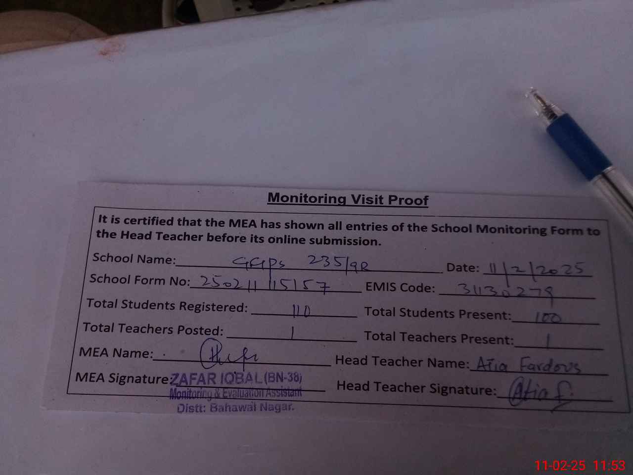 | Monitoring Date: 11-02-2025 | Start Time: 11-02-2025 11:40 AM | End Time: 11-02-2025 11:53 AM | Name of MEA: Za**** Iq**** BN**** | |
