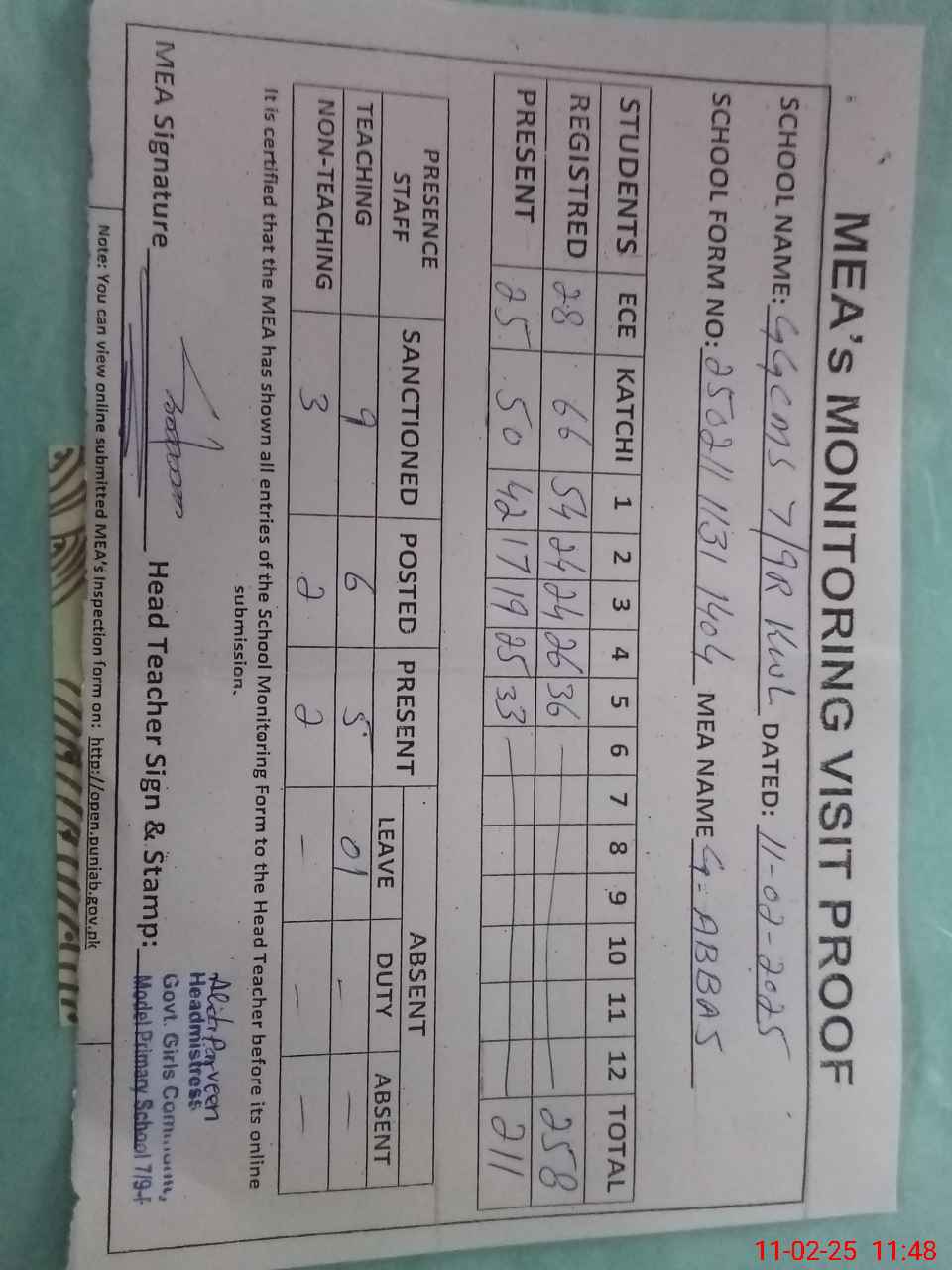 | Attendance Register | Head Teacher | MEA with School | Visit Proof |