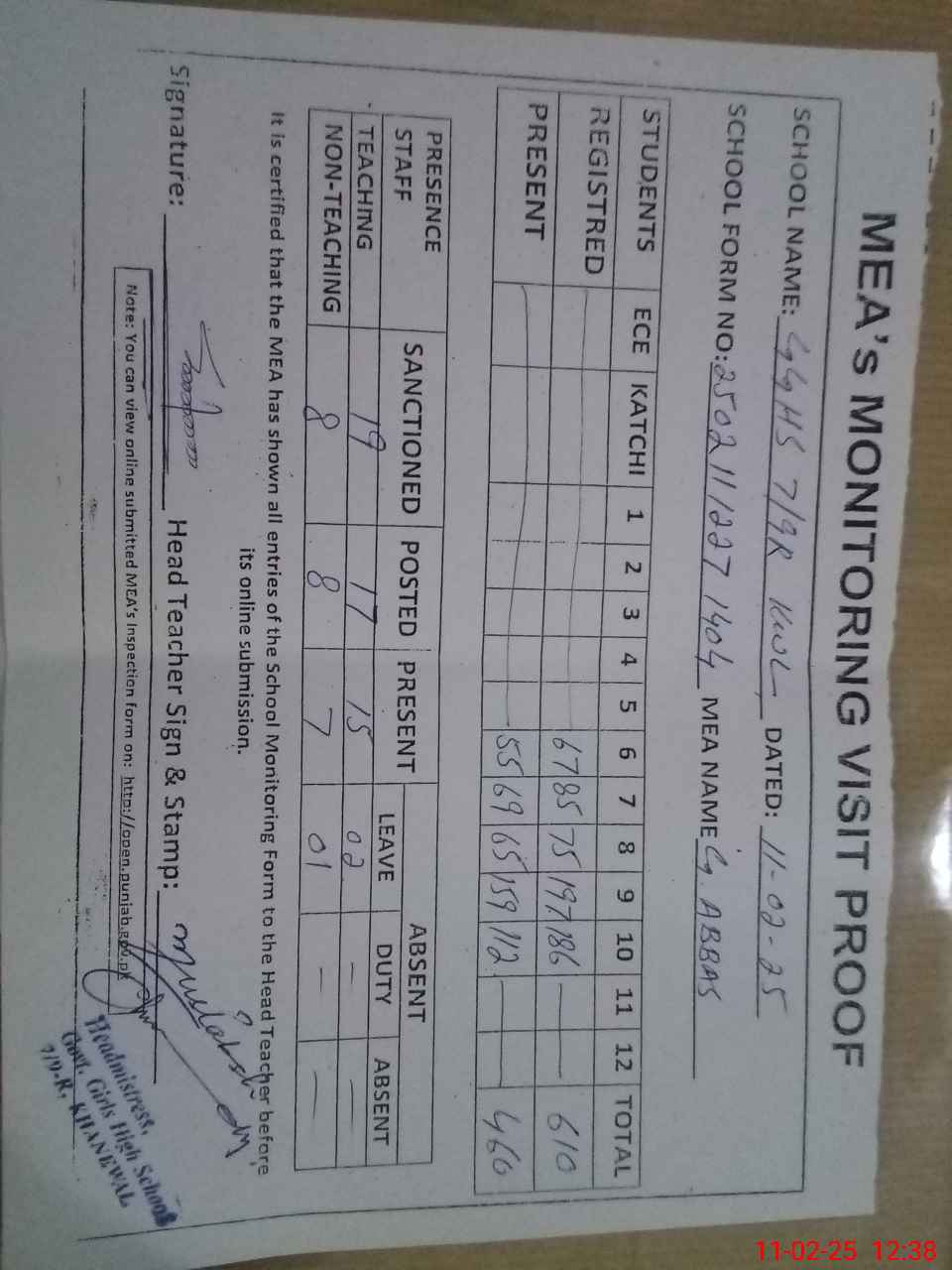 | Attendance Register | Head Teacher | MEA with School | Visit Proof |