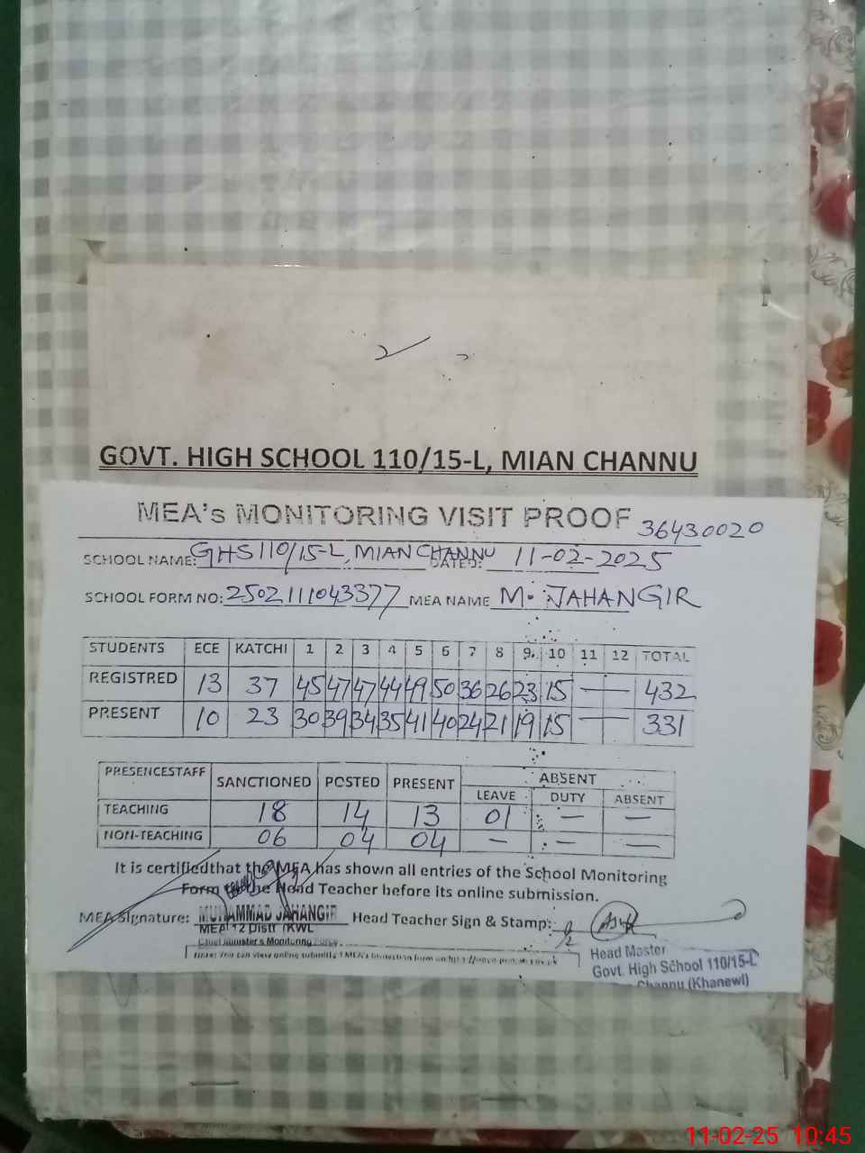 | EMIS Code: 36430020 | Name of School: GHS 110/15-L, MIAN CHANNU | |||