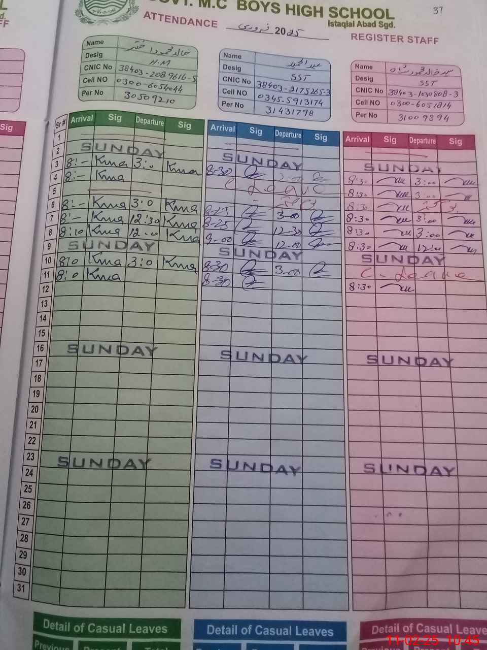 | CNIC | Full Name | Designation | R/C | Absence during last cal. month |