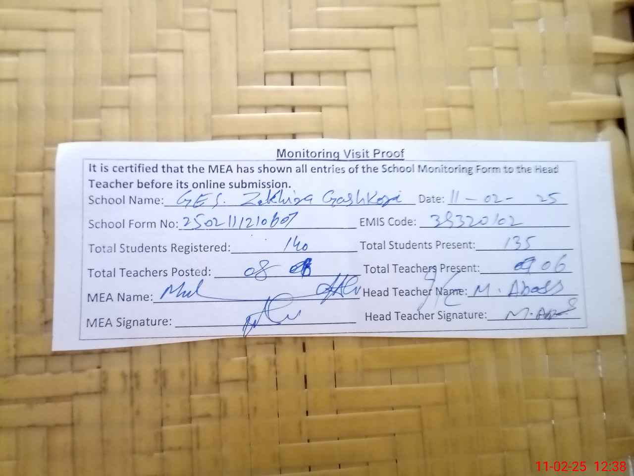 | Attendance Register | Head Teacher | MEA with School | Visit Proof |