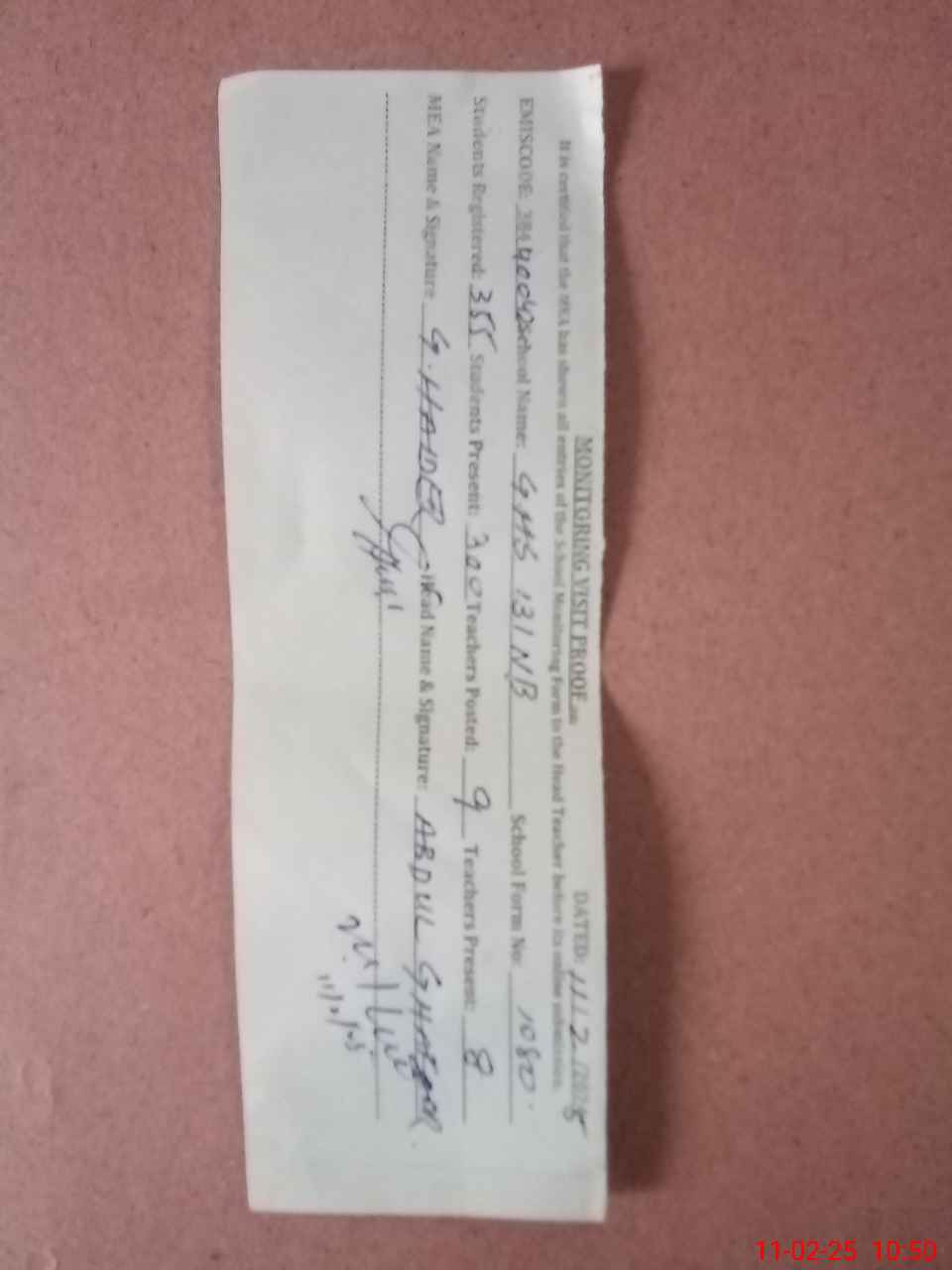 | Monitoring Date: 11-02-2025 | Start Time: 11-02-2025 10:00 AM | End Time: 11-02-2025 10:52 AM | Name of MEA: GH**** HA**** | |
