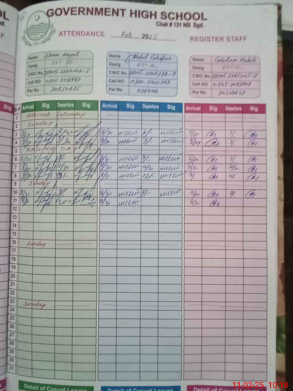 | CNIC | Full Name | Designation | R/C | Absence during last cal. month |