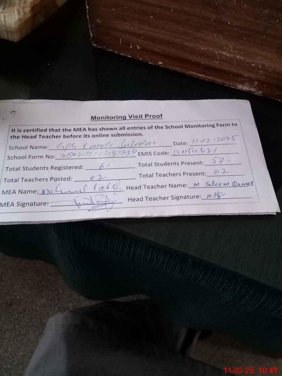 | Attendance Register | Head Teacher | MEA with School | Visit Proof |