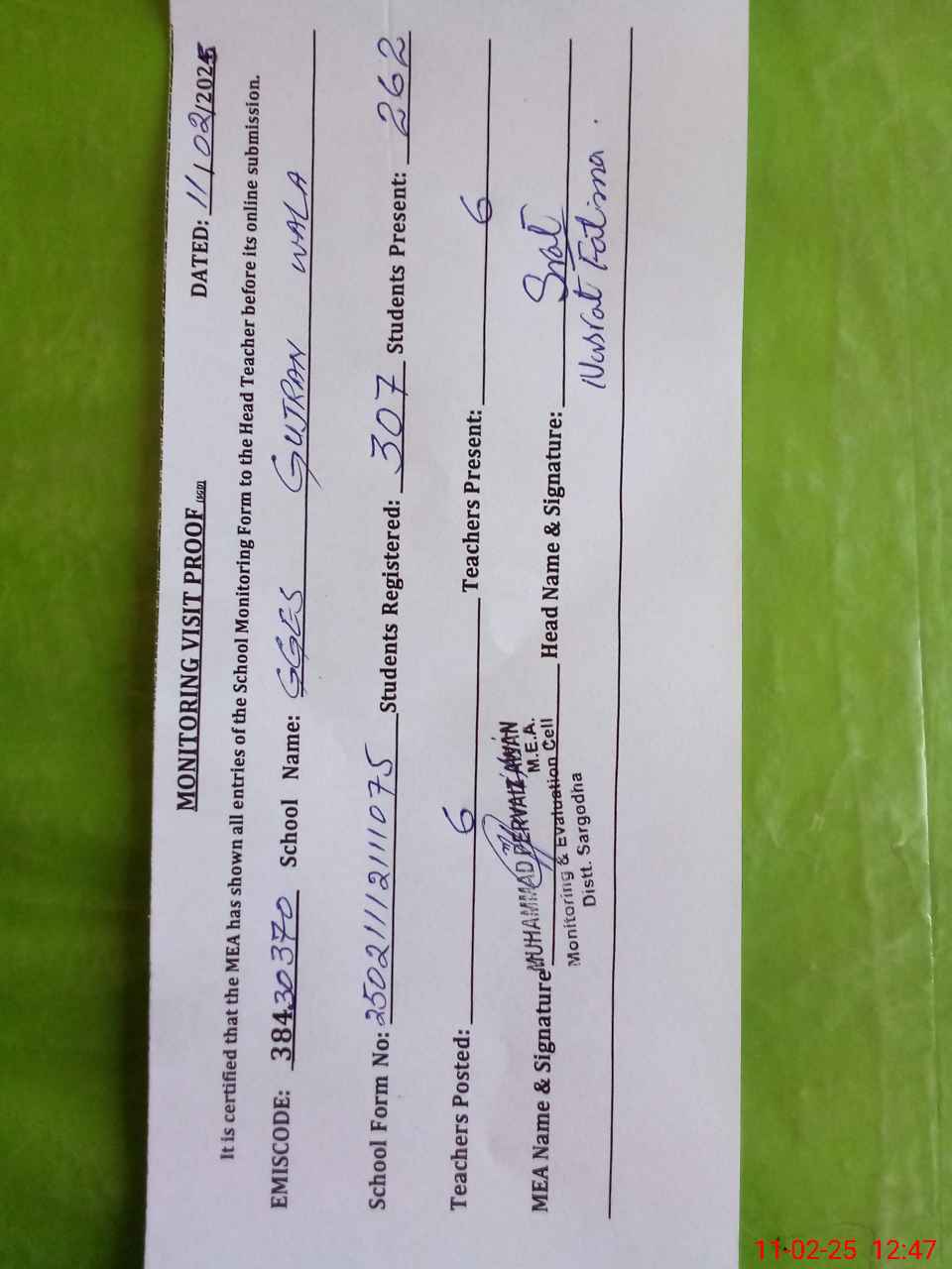 | Attendance Register | Head Teacher | MEA with School | Visit Proof |
