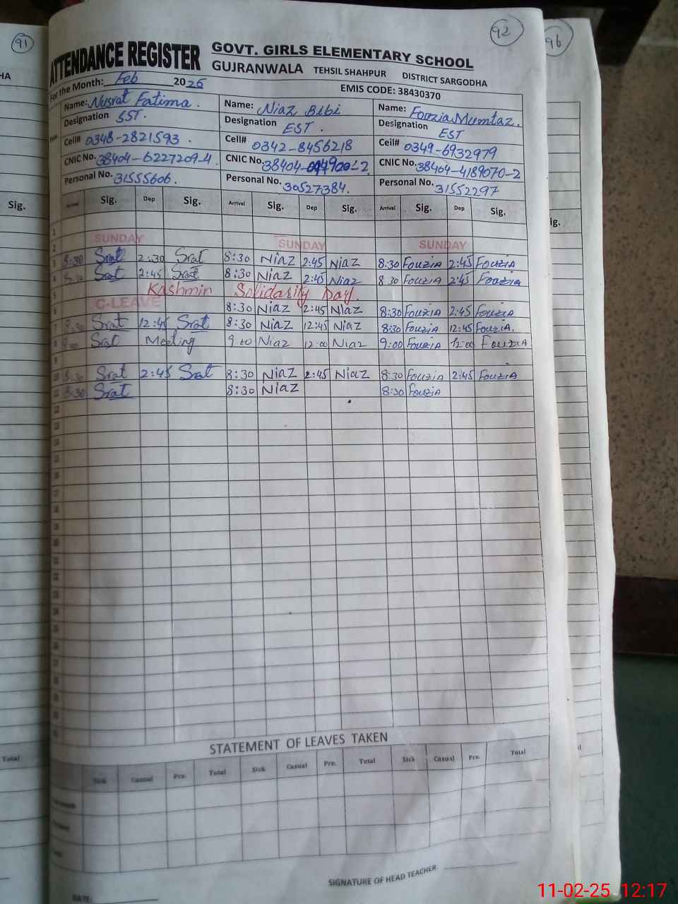 | Name: NU**** FA**** Designation: (School Headmaster's/Headmistress's) SST (SCIENCE) Phone/Cell Number: 03**** |
