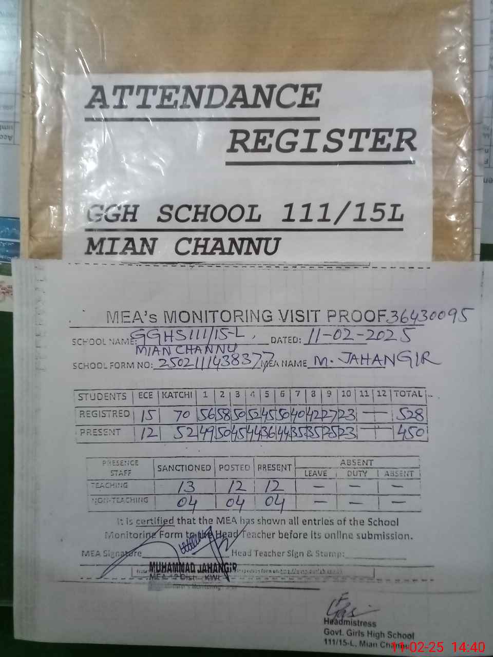 | Attendance Register | Head Teacher | MEA with School | Visit Proof |