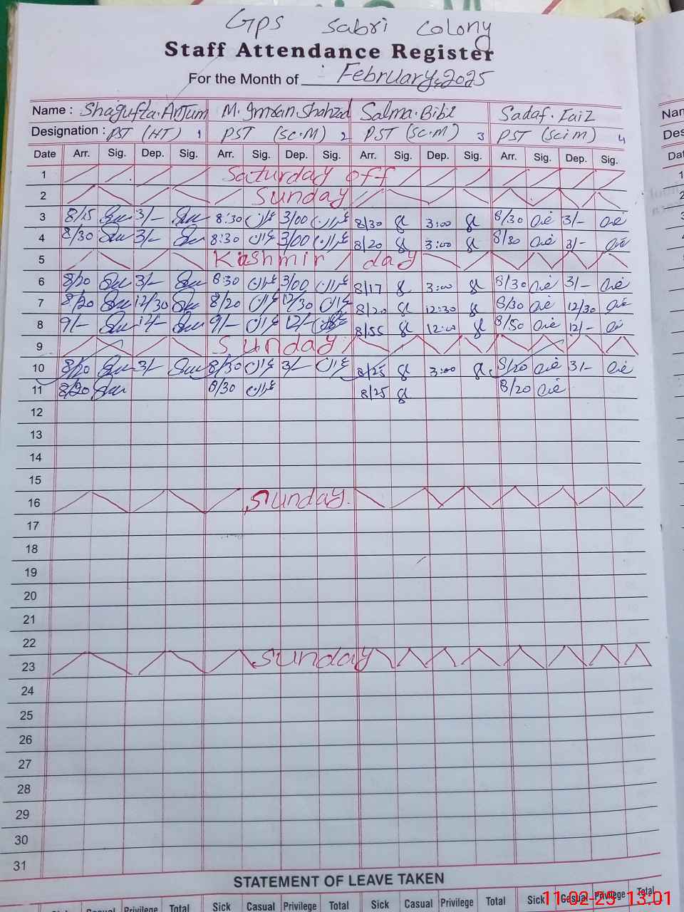 | CNIC | Full Name | Designation | R/C | Absence During Last Calender Month |