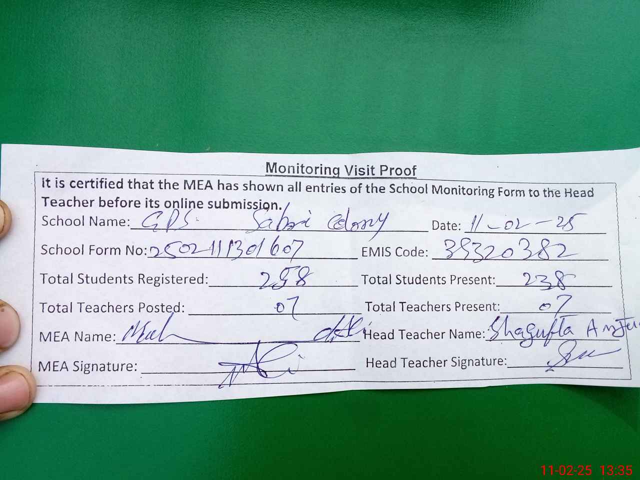 | Attendance Register | Head Teacher | MEA with School | Visit Proof |