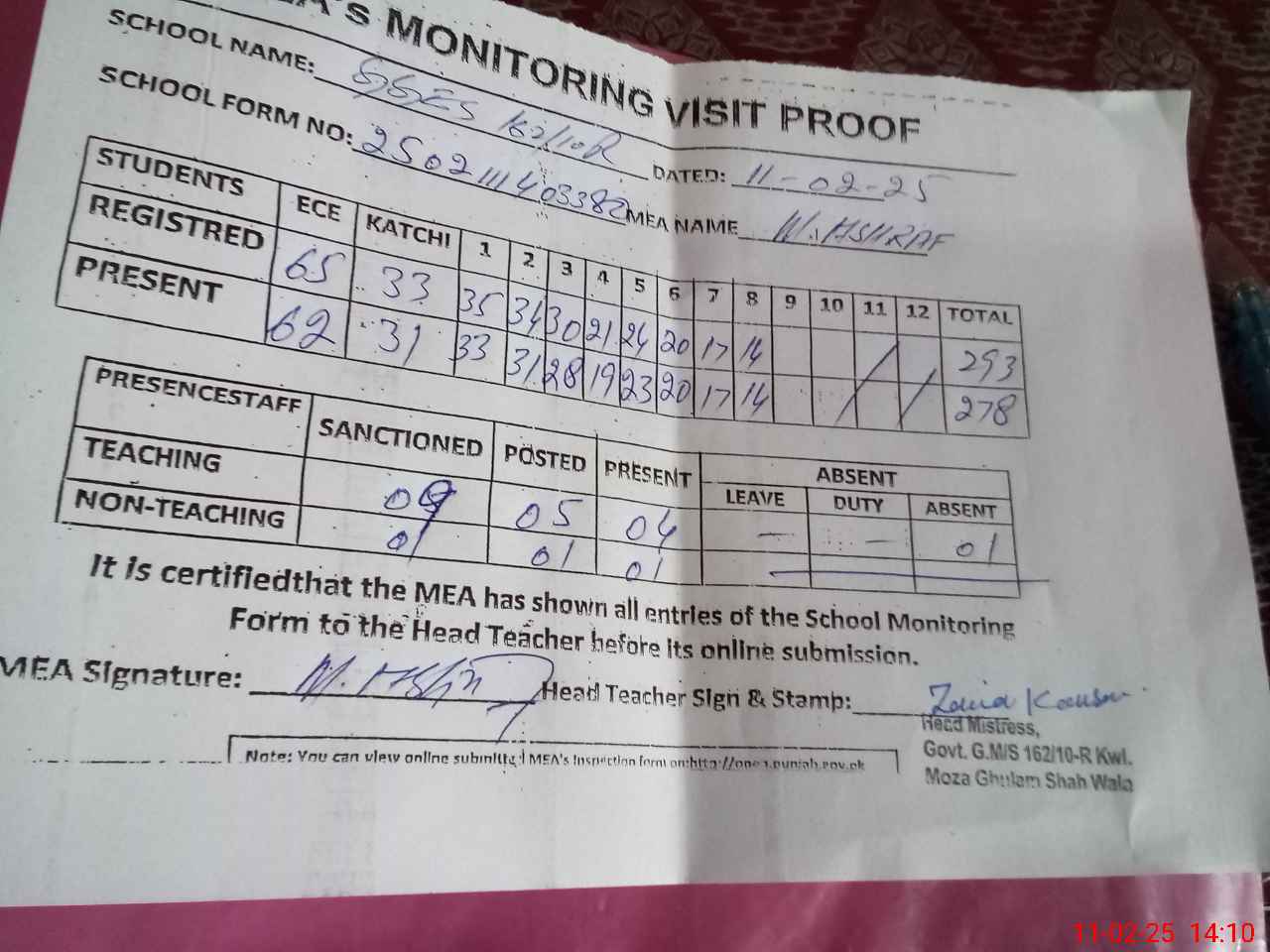 | Attendance Register | Head Teacher | MEA with School | Visit Proof |