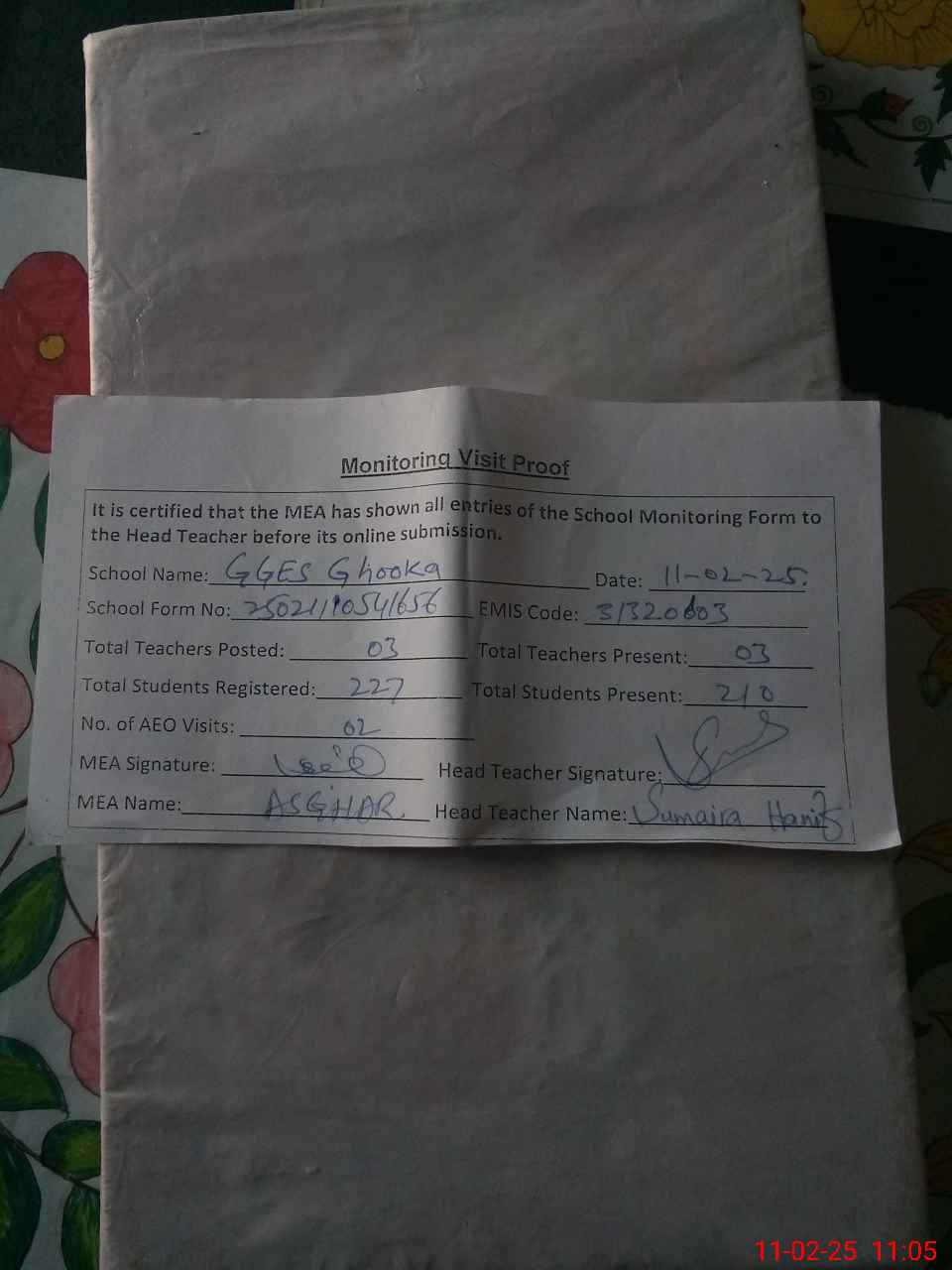 | Attendance Register | Head Teacher | MEA with School | Visit Proof |