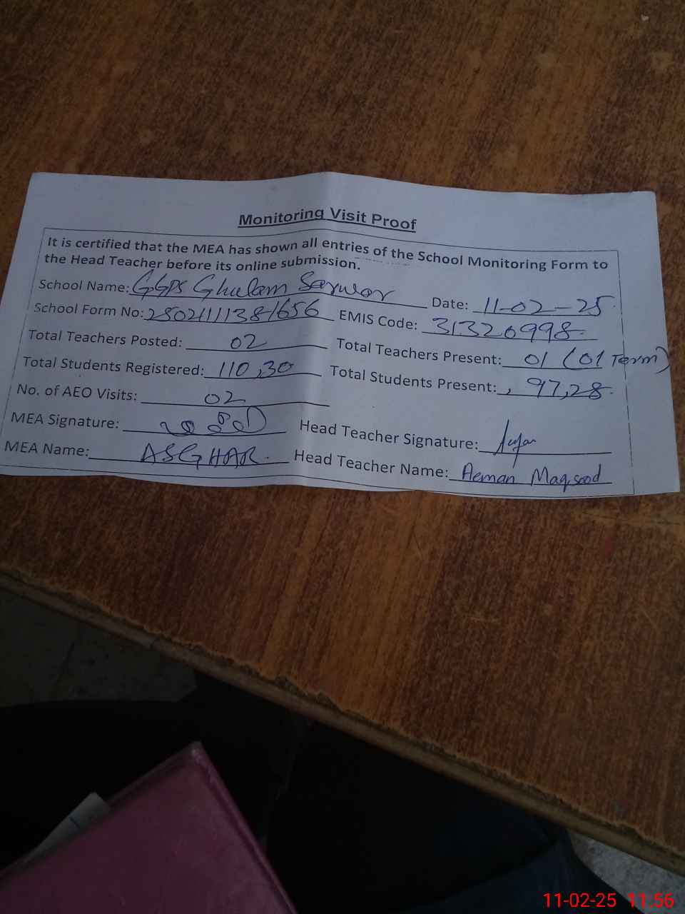 | Attendance Register | Head Teacher | MEA with School | Visit Proof |