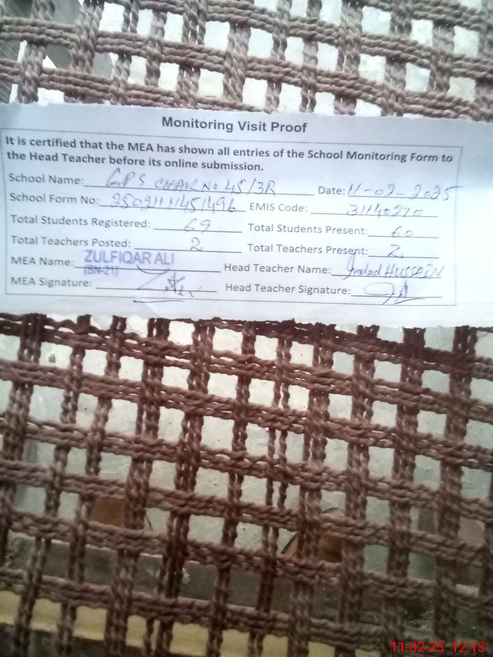 | Attendance Register | Head Teacher | MEA with School | Visit Proof |