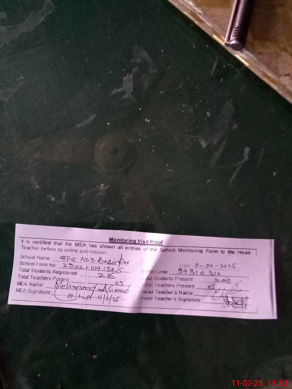 | Attendance Register | Head Teacher | MEA with School | Visit Proof |