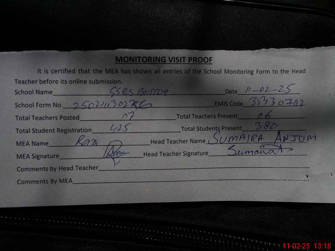 | Attendance Register | Head Teacher | MEA with School | Visit Proof |