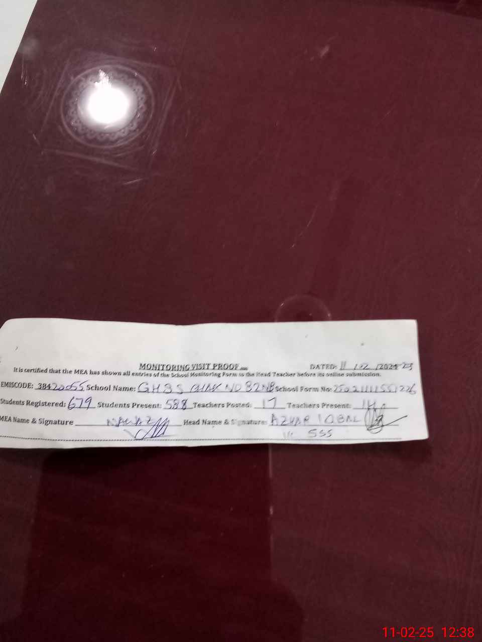 | Attendance Register | Head Teacher | MEA with School | Visit Proof |