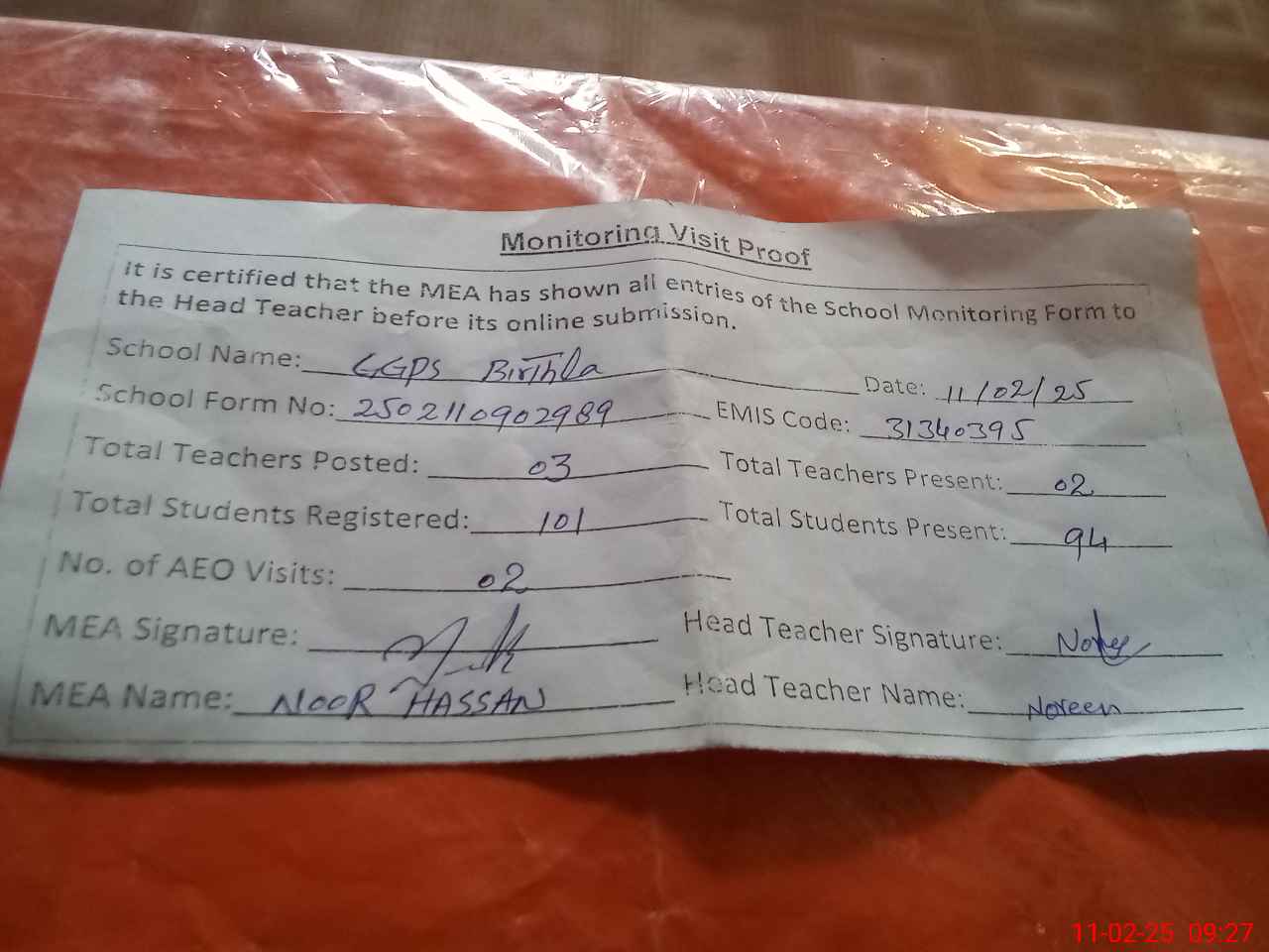 | Attendance Register | Head Teacher | MEA with School | Visit Proof |