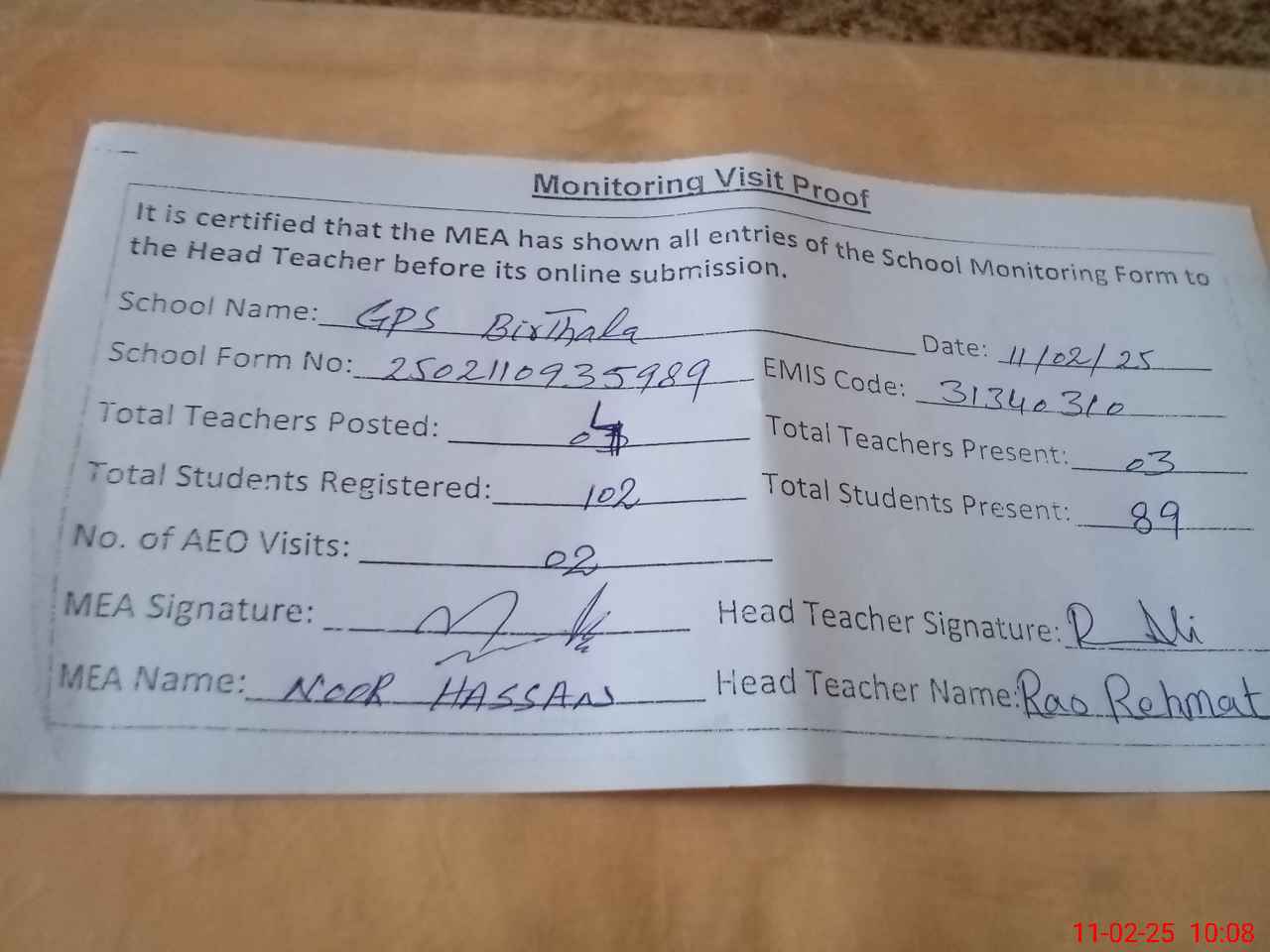 | Attendance Register | Head Teacher | MEA with School | Visit Proof |