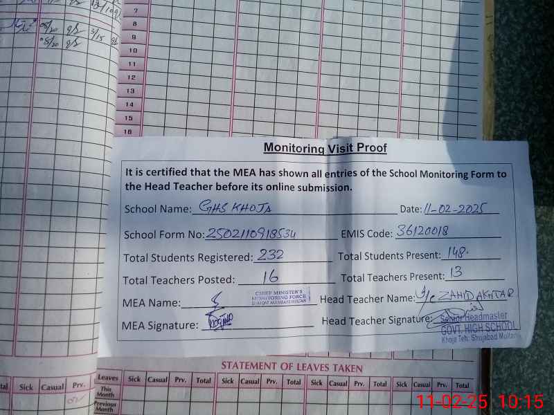 | EMIS Code: 36120018 | Name of School: GHS KHOJA P.O. KHOJA TEH. SHUJABAD DISTRICT MULTAN | |||