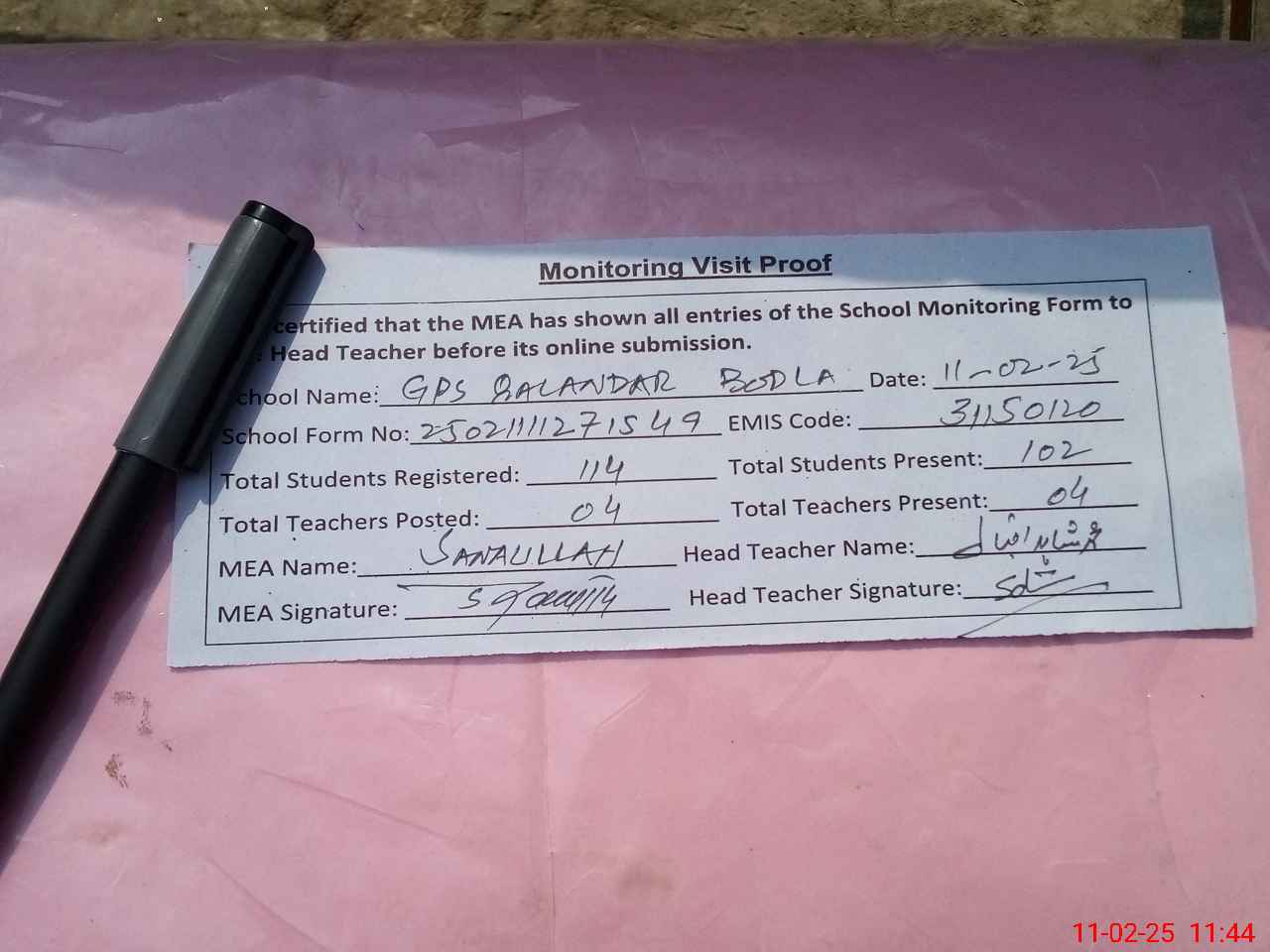 | EMIS Code: 31150120 | Name of School: GPS QALANDAR BODLA | |||