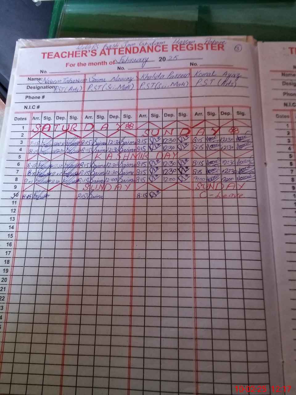 | CNIC | Full Name | Designation | R/C | Absence During Last Calender Month |
