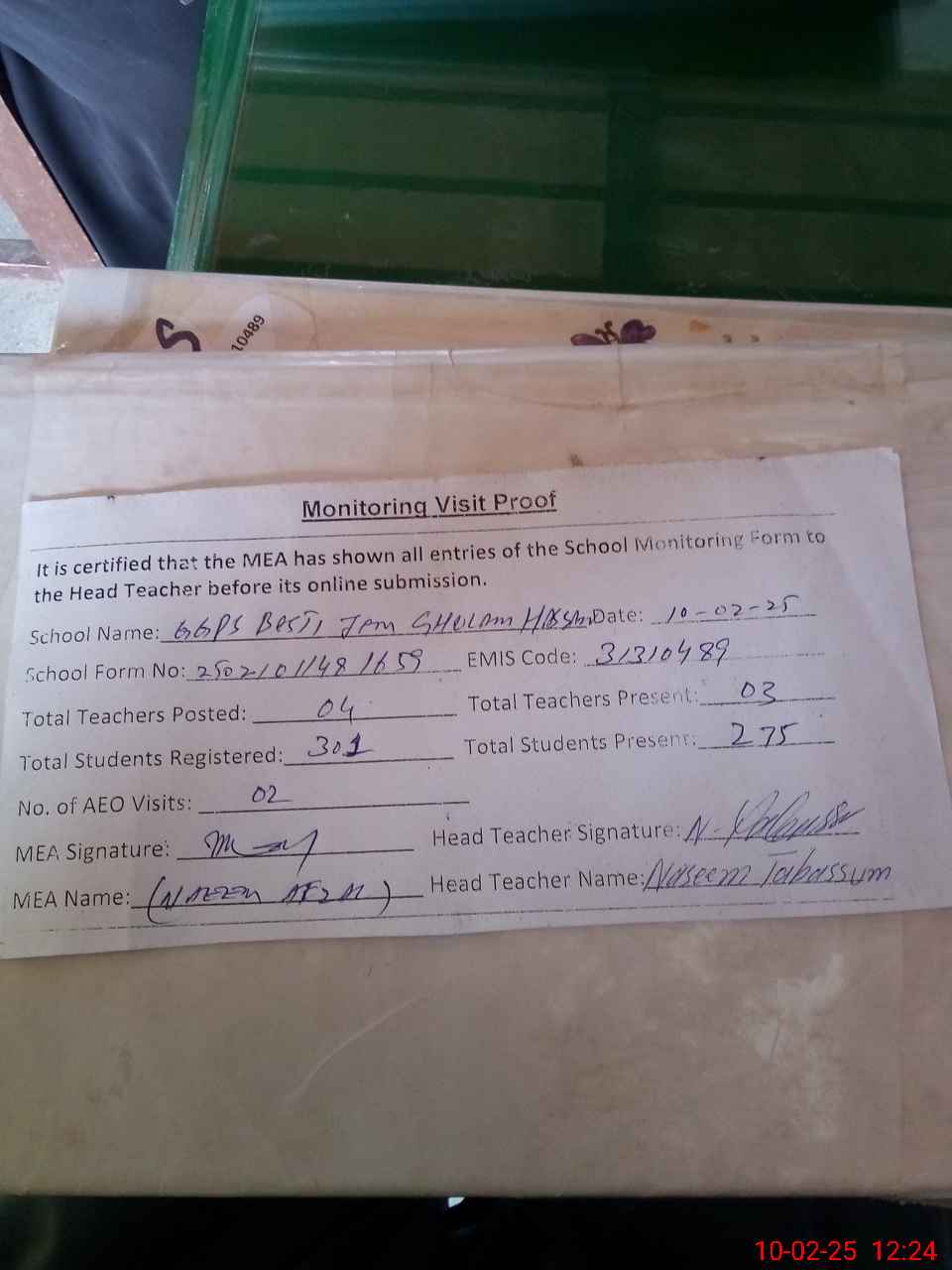 | Attendance Register | Head Teacher | MEA with School | Visit Proof |