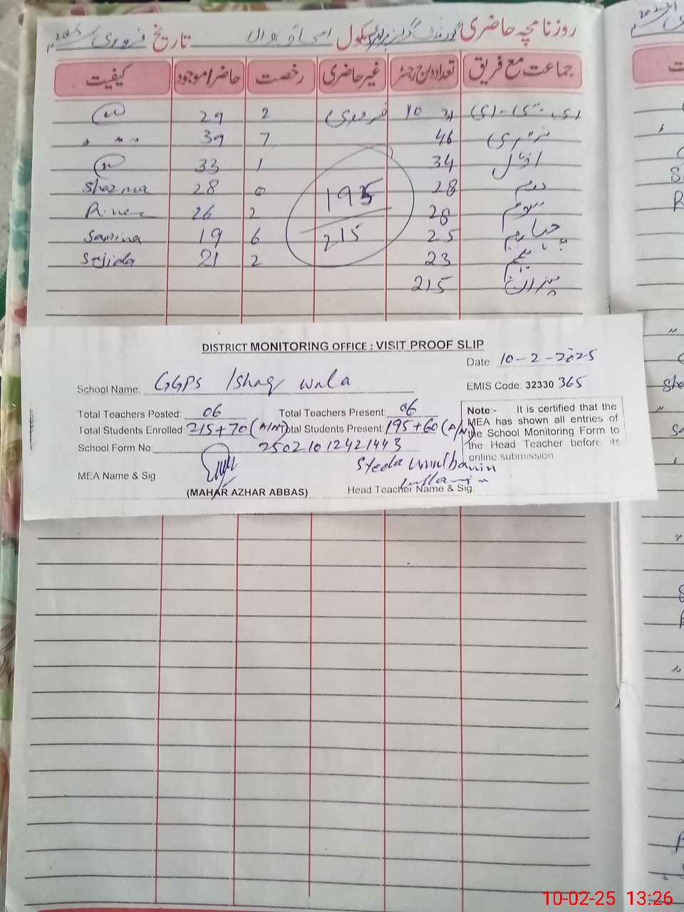 | Attendance Register | Head Teacher | MEA with School | Visit Proof |