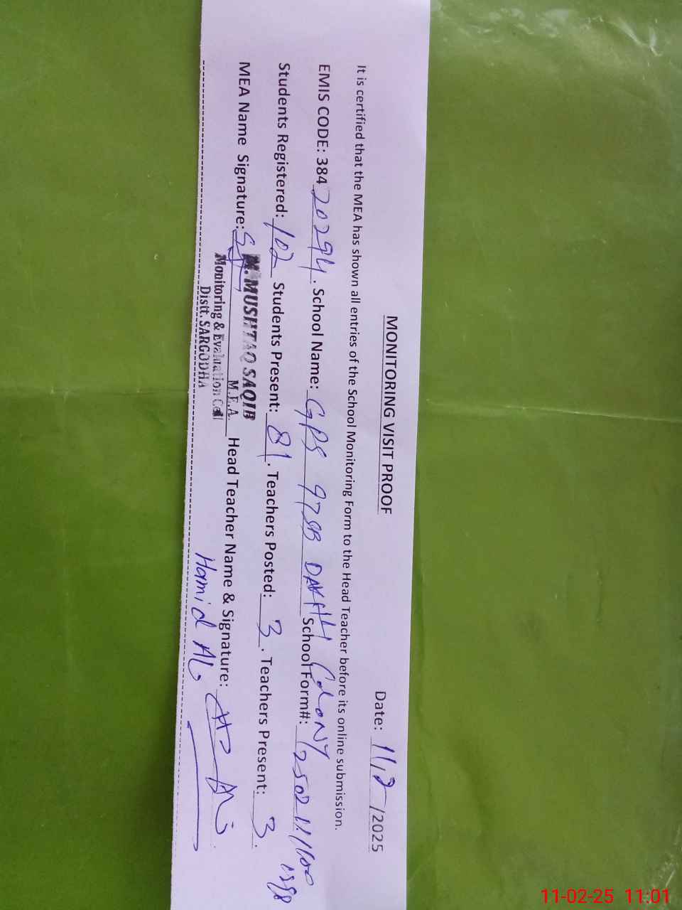 | EMIS Code: 38420294 | Name of School: GPS CHAK NO.97 SB (DAKHLI COLONY) | |||