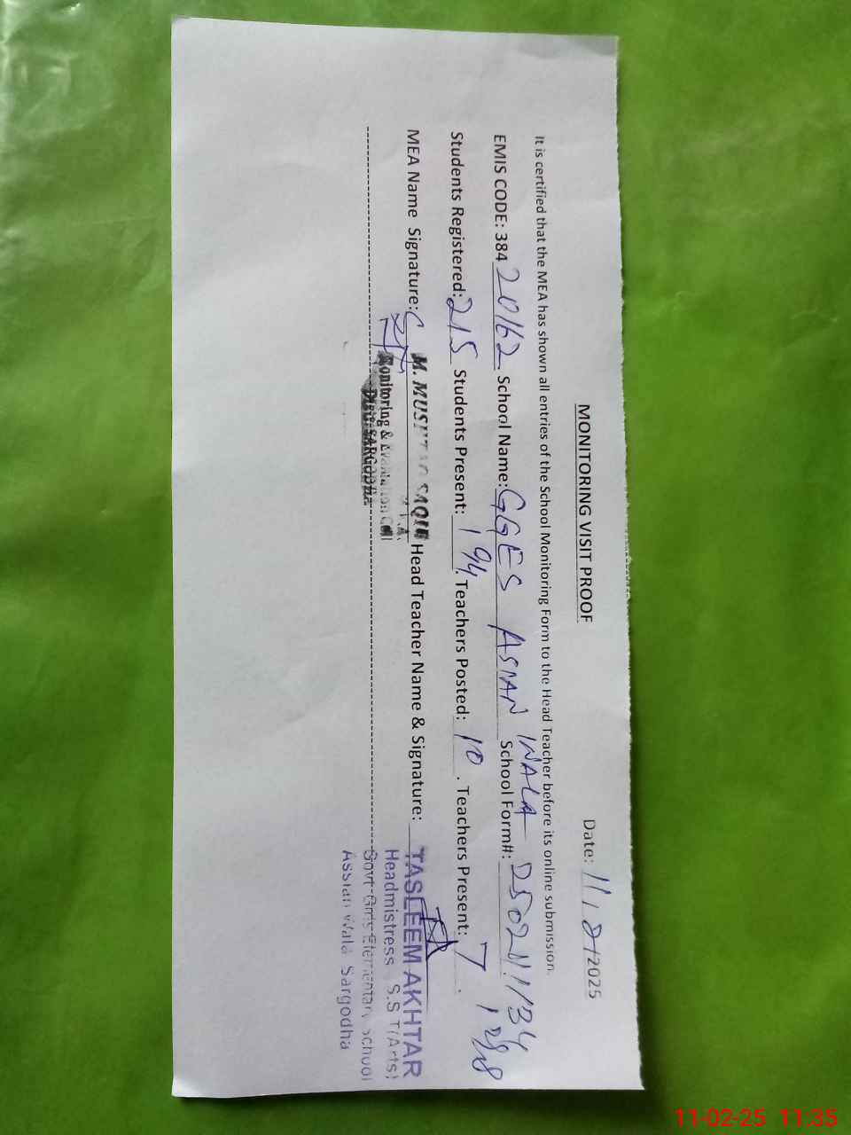 | Certified that this School was Inspected by the Undersigned MEA/DMO Today and the Information Stated Above is as Per Record. | |||||