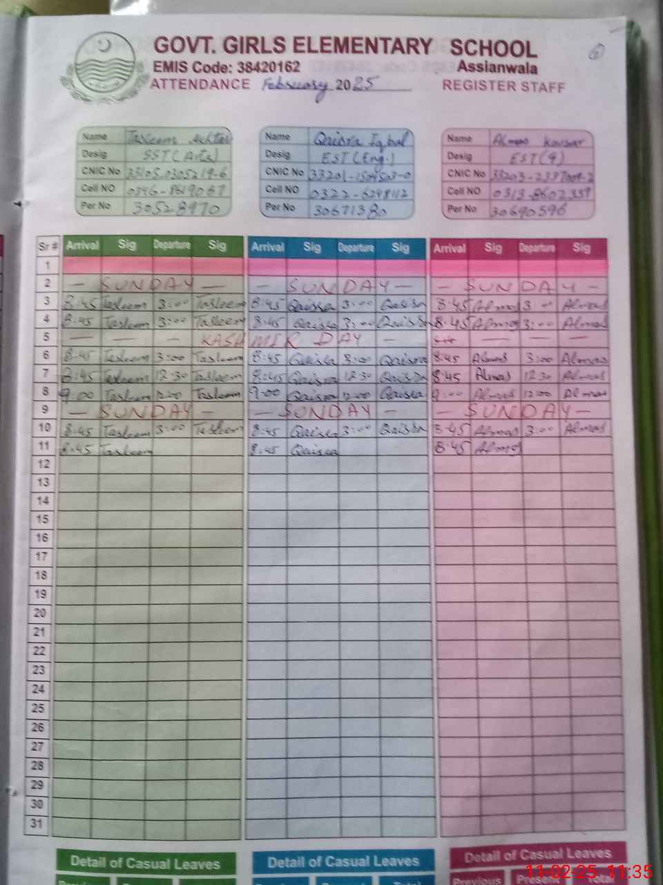 | CNIC | Full Name | Designation | R/C | Absence During Last Calender Month |