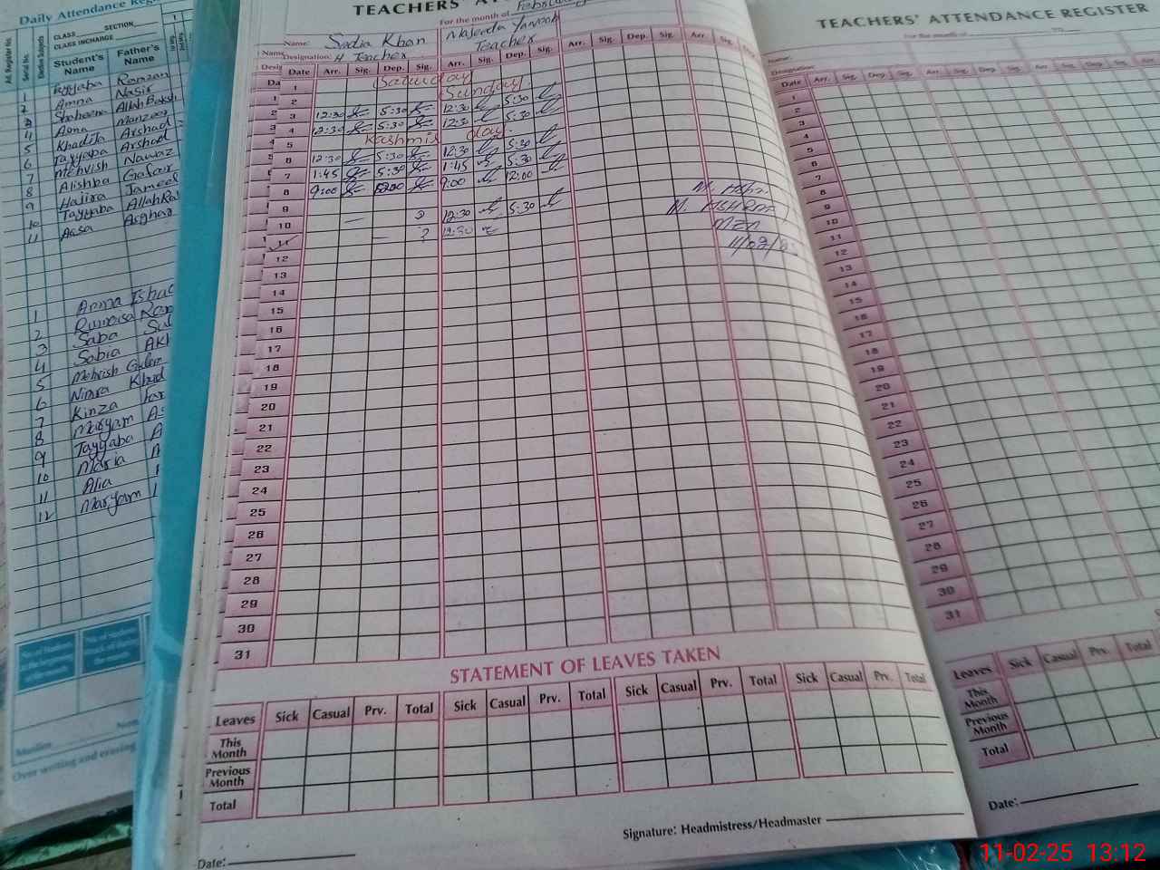 | Remarks (Use Separate Page if Required): Head teacher found absent All record under lock Only one 2nd shift teacher preasent Students attendance register not available Morning teachers register not available | |||||