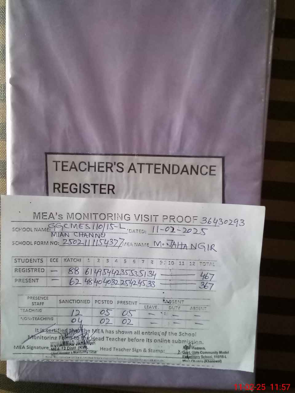| Attendance Register | Head Teacher | MEA with School | Visit Proof |